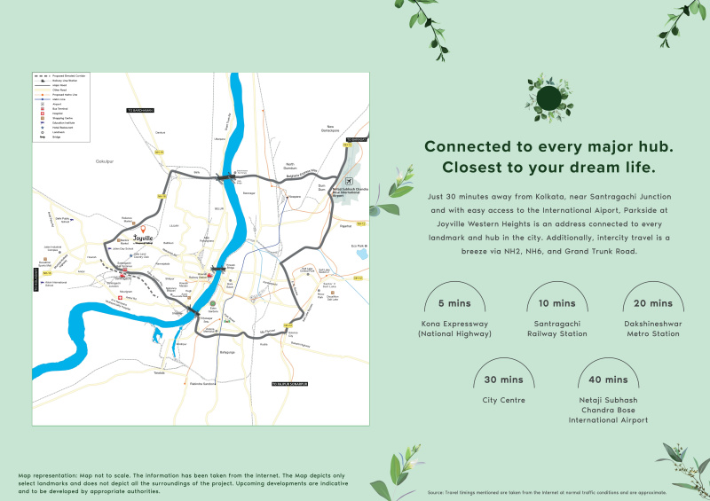 Located near Salap Junction, 1 km from Kona Expressway (NH6), 10 mins from Santragachi Station, and 40 mins from Kolkata Airport. Surrounded by schools, hospitals, and malls like DPS International, Narayana Hospital, Avani Mall & Eco Park.